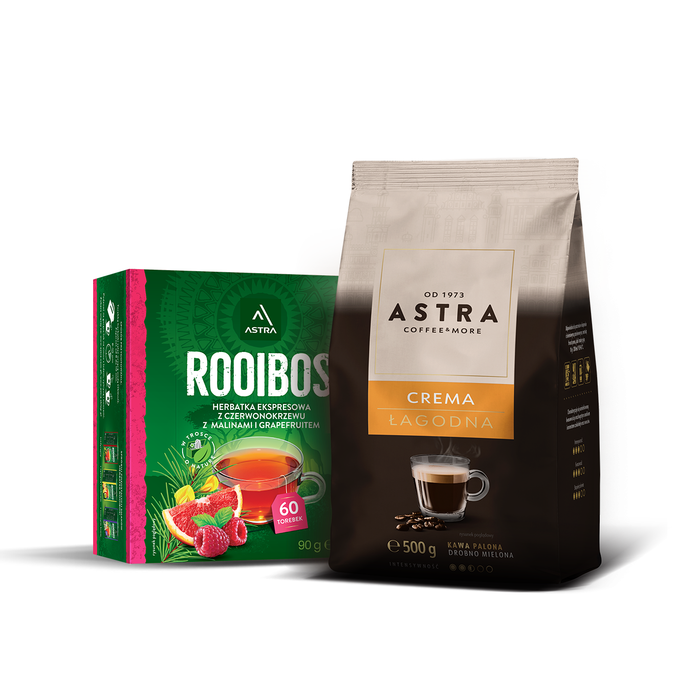 Zestaw Astra: Kawa Łagodna Crema mielona 500 g + Rooibos z maliną i grapefruitem 90 g (60 torebek)