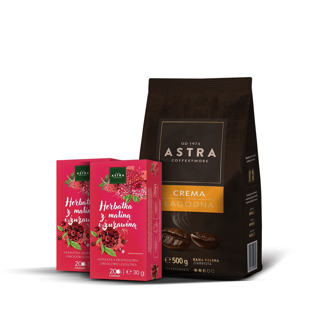 ASTRA Zestaw Kawa Łagodna Crema 500g ziarnista + 2x Herbatka z maliną i żurawiną 20 tor. ex.