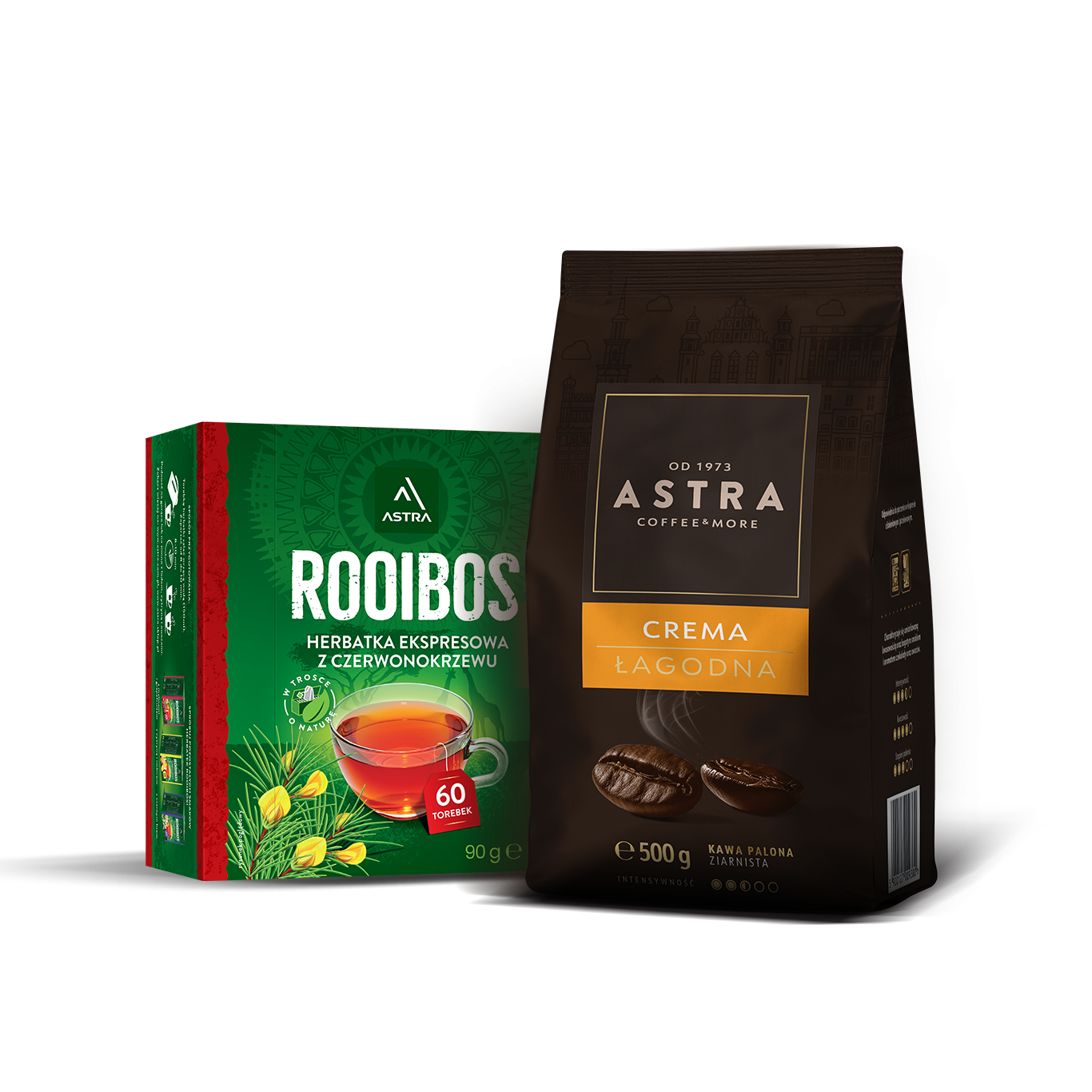 Zestaw Astra: Kawa Łagodna Crema ziarnista 500 g + Rooibos klasyczny 90 g (60 torebek)